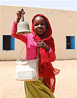 | ヤラの学校に通う低学年の女の子が、2時間目の授業の開始を知らせるベルを鳴らしています。 |