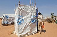 ユニセフのロゴがついた簡易トイレに入ろうとしている男の子。トイレの後に手を洗うための水を持っている。西ダルフール州都、エル・ジェナイナ郊外のアル・リヤド避難民キャンプにて。 |
