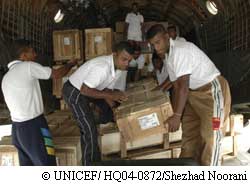 被災直後に開始した現地調達分の支援物資の配布は30日までに終了しましたが、29日と30日 (全て現地時間)にはコペンハーゲンのユニセフ物資供給センターから65トンの追加支援物資が到着しています。