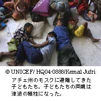 「孤立した西海岸から避難してきて、バンダ・アチェ(州都)の郊外までたどりついた人たちのために軍が駆り出されています」とユニセフの緊急広報官のゴードン・ワイスは語っています。