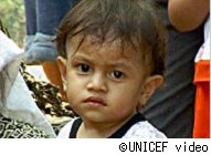 津波で生き残ったサイフディンとその一家は、ユニセフとECHOの共同事業の支援を受けた家族の一つです。彼と妻、二人の子どもは、バンダ・アチェ郊外で1つのテントを他の家族と共有しています。せまいスペースには耐えられますが、水場がないのはつらいと言います。キャンプには水道栓が2、3カ所しかなく、いつも混み合っています。特に礼拝の時間の前になるとモスクに入る前に清めをする人々の列ができます。