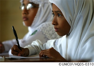 災害により数十万の生徒たちが影響を受けたため、子どもたちが学校に戻れるようにすることもユニセフの優先課題の一つでした。初期の支援によって85-100%の子どもたちが学校に戻りました。現在は、破壊された施設の再建や、教師の研修、その他の方法などにより教育の質を高めることに重点が移行してきています。