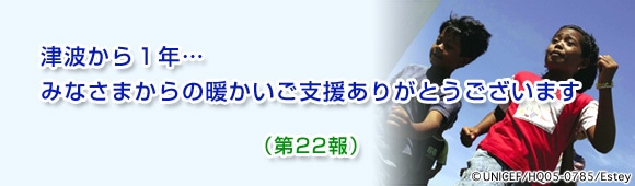 なお、スマトラ沖地震・津波被災地に対するユニセフ復興募金は、2005年6月24日をもって受付を終了いたしました。本募金に対しては、半年間にわたって日本全国から多くのご支援をいただき、募金額はおよそ33億4千万円にのぼりました。皆様のご支援ありがとうございます。 当協会では、紛争や災害など緊急事態に直面している地域の子どもや女性のための緊急募金の受付を行っております。みなさまの継続的なご支援をどうぞよろしくお願いいたします。 少しずつ希望が戻ってきました −ユニセフ事務局長 アン・ベネマンより >>