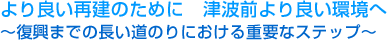 3つ目の活動領域は、目立たないけれども非常に重要な作業である計画プロセスと合意形成です。命を守り、健康を保ち、基本的な保護を確保した上で、この規模の復興支援をするにあたって何よりも大切なのは、人々が自分の将来に責任を持てるように力づけることなのです。