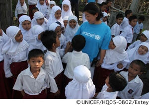 この一年の間にユニセフは津波地域に住むおよそ350万人の子どもと女性を支援することができました。約120万人の子どもたちがユニセフの支援するキャンペーンの一環としてはしかの予防接種を受け、50万人以上の子どもと母親がマラリアの感染を防ぐために殺虫処理を施された蚊帳を提供されました。