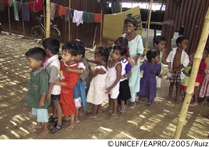 「イムランは病気になってもおかしくない状況だったんです。でも彼は仮設住宅の乳幼児発達センターでよいケアを受けたおかげで、今は完全に健康です。」とヴィジャーヤは言います。ビジャーヤは、ナガパッティナム郡でユニセフのプロジェクトを実施しているTrust for HopeというNGOによって、母親と子どもの保健と栄養についての研修を受けた317人のボランティアの一人です。