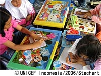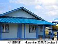 インドネシアのアチェ州に、子どもたちが遊び、学ぶための恒久的な施設がオープンしました。2004年12月のスマトラ沖地震・津波の被害に遭った子どもたちのための施設です。 「これはいわば一里塚のようなもの」と語るのはユニセフのバンダアチェ事務所の『子どもの保護』担当官のロベルト・ベネスです。「これからはコミュニティ参加をより多く必要とする長期的な解決に向けて歩み出す必要があります」 津波の被害を受けてから数日のうちに、ユニセフとそのパートナー機関は、『子どもに優しい空間』を避難キャンプ等に設置し、子どもたちが遊び、平常心を取り戻すことができる空間を作ってきました。キャンプに設置されたテントの中では、子どもたちの出身地や名前などの情報を登録し、ソーシャルワーカーやボランティアが見守る中で、子どもたちが「安全」に過ごせるよう支援してきたのです。こうした臨時のセンターの恩恵を受けたアチェの子どもの数は17,000人に上ります。 もっと多くの子どもセンターを