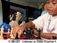 どこに子どもセンターが必要とされているかを見極める一方で、ユニセフは、どのコミュニティにセンターを持続的に運営するだけの能力があるかどうかを検討します。地元のパートナー機関やインドネシア政府は、電気代や水道代などの維持費の支援を約束していますが、2007年からは、コミュニティ自身が子どもセンターの運営を担っていくことが期待されています。 「コミュニティに当事者意識を持ってもらいたいし、そうした気持ちを作りあげたいと思っています」とコテング。「コミュニティは、これが自分たちのセンターであり、自分たちの子どものためのもの、運営も自分たちの責任だと感じてほしいのです」。この施設を引き継ぐ前に、このプログラムのこれからの成長と発展のために、子どもセンターのスタッフは資金調達の方法についての研修を受けています。 ユニセフとそのパートナー機関は、子どもセンターをどうやったらもっといい施設にできるか、コミュニティの子どもとおとなたちから意見を求めるようにしています。センターを監視する役割を担うために選ばれたボランティアは、コミュニティ同士のネットワークを作り、保護者や教師、そのほかの人たちから成る支援グループを作ることが求められています。その結果、より多くの地元メンバーが参加しセンターを支える力となっています。「これこそ私たちが目指していることなのです」とコテングは言います。 なお、スマトラ沖地震・津波被災地に対するユニセフ復興募金は、2005年6月24日をもって受付を終了いたしました。本募金に対しては、半年間にわたって日本全国から多くのご支援をいただき、募金額はおよそ33億4千万円にのぼりました。皆様のご支援ありがとうございます。 当協会では、紛争や災害など緊急事態に直面している地域の子どもや女性のための緊急募金の受付を行っております。みなさまの継続的なご支援をどうぞよろしくお願いいたします。 |
