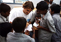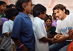 2004年、インド洋一帯の国々を襲ったスマトラ沖地震・津波の発生から間もなく丸2年となる22日、テニス界のスーパースター、ロジャー・フェデラー ユニセフ親善大使が、インド南部のタミールナドゥ州を訪問。津波被災地を、災害発生前の状況よりも子どもたちにとって住み易い場所にするために続けられる復興支援活動の最前線を視察しました。 タミールナドゥ州だけで8000人もの命を奪った津波は、学校200箇所、子どものケア施設350箇所も一瞬にして瓦礫の山に変えてしまいました。親善大使に任命されてから初めてとなる「現場視察」。フェデラー氏はその目的地として、ユニセフの復興支援活動が続く、特に津波被害の大きかったクッダロール地方を選びました。 小学校を訪問したフェデラー氏。彼が出会ったのは、生まれてはじめて椅子や机を手にした多くの子どもたちでした。ユニセフは、復興支援の一つとして、それまでこの地域の多くの小学校には存在しなかった机や椅子などの教育家具や教材を、330校に提供。小学生4万人・教員3500人がこの恩恵に浴しています。 以前より、もっと子どもに優しい環境を創る為に