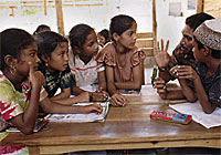仮設の教室で授業を受ける子ども達、スリランカ南部のキリンダ・イスラム高校にて。新しい「子どもにやさしい」学校は、国際的な津波復興支援の一環として、現在改修工事中です。 |