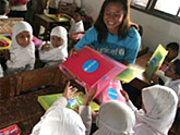 | ユニセフの広報官が、子どもたちに教材の入った学用品キットを配布している |