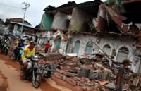 | インドネシアのパダンの倒壊した店や家屋の前を通る人々。 |