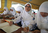 | ユニセフが支援した臨時教室の中で、物理のクラスを受ける10年生の子どもたち。地震発生から一週間未満に、ユニセフはこの地域に250の臨時学校用テントを提供しました。 |
