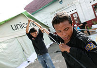 | スマトラ沖地震被災地で、ユニセフが支援した臨時教室用のテントを組み立てる現地スタッフ。 |