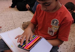 | ダマスカス市内の避難となった学校で、お絵かきするマジェドちゃん(11歳)。彼は、家族17人と一緒に、ここで避難生活を送っている。 |