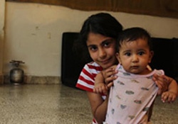 | シリアのダマスカスで避難を余儀なくされた人々のための避難所として利用されている学校で、生後8ヵ月の妹を抱くジエナブちゃん(7歳)。8人家族のジエナブちゃん一家は、先月、3回も住む場所を変えざるをえなかった。 |