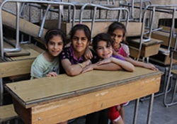 ダマスカス北部のハイ・ティシュレーンに暮らしていたイッサムちゃん(7歳)も、7人の家族と叔父一家と共に、学校での避難生活を余儀なくされた子どもの一人です。イッサムちゃんは、それでも、この学校と以前通っていた学校の共通点を見つけては、元気づけられているようです。「夜遅くに着いて、あたりは真っ暗だった。次の日の朝は早く起きて、こっそり教室の外に出て、学校を見てみたんだ」「バルゼ・バラダの学校と、とても似ていると思った。今は、たくさんの人でいっぱいだけど」イッサムちゃんは、笑いながらこう話してくれました。