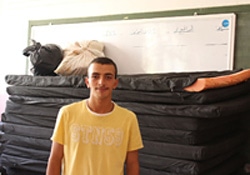 | イヴァドさん(17歳)は、家族と共に、学校に避難してきました。イヴァドさんは、毎朝たくさんのマットを積み上げて、教室の中に、人々が座れる空間を作ります。そして夜になると、、13人の家族が眠れるように、またマットレスを敷きます。 |