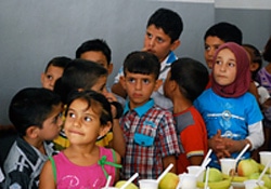 | ユニセフの支援でワジアナクール小学校に設置された“子どもに優しい空間”。おやつの時間には、ユニセフが、栄養の教育も目的に、果物とヨーグルトを提供している。 |