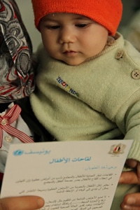 予防接種は、約1,200箇所の保健センターで実施されている一方、100以上の移動予防接種チームがシリア全域の一時避難所に避難している子どもたちを訪れ、予防接種を実施。移動予防接種チームによる活動は、本キャンペーンの柱の一つとなっています。テレビや携帯電話のショートメール(SMS)を利用した啓発活動、また保健教育活動は、親が子どもに予防接種を受けさせる意識を高める助けとなっています。