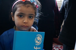 | ホムスの公立の学校でユニセフが支援したノートを手にする女の子 |