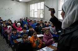 多くの難民を受け入れている地域の学校では、クラスの人数が定員を大幅に上回り、100人近くに達しているところもあります。