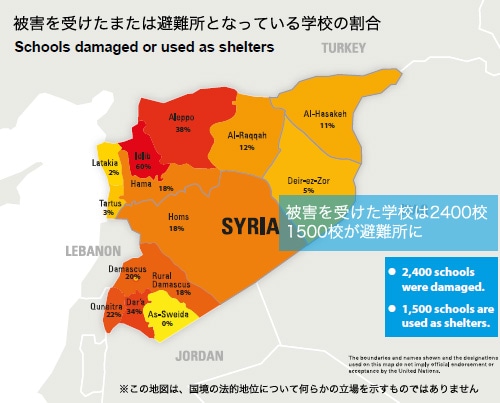 シリア国内の5分の1の学校が攻撃を受けて損傷したり、あるいは避難所として使用されているため、学校の再開もままならない状況が続いています。