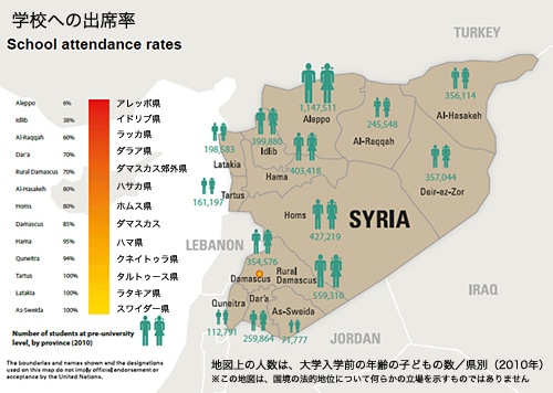 「シリアの教育システムは、この暴力の影響で揺らいでしまっています」「かつてシリアは、質の高い教育を誇っていました。しかし今は、急速に後退してしまっているようです」こう話すのは、ユニセフ・シリア事務所のアブデル・ジェリル代表です。(参考:純就学率男子97%、女子92% 出典:ユニセフ『世界子供白書』2009)