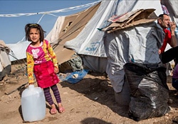 | イラクのドミズ難民キャンプで水を汲んでいる女の子 |