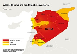 | シリア国内での水とトイレの県別利用状況(2013年2月時点)色が濃い県ほど利用が厳しい状況にある |