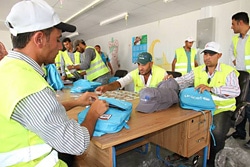| ヨルダン・ザータリ難民キャンプで、通学カバンに学用品などをつめるシリア難民ボランティアたち。「キャンプには大勢の子どもたちがいる。子どもたちを助けるのが務めだ」と語る父親の姿も。 |