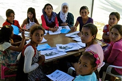 | レバノンのベッカー高原に避難したシリアの子どもたち。「バック・トゥー・ラーニング(再び学ぼう)」の取り組みでつくられたテントで学んでいる。 |