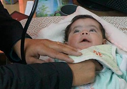 | ホムスの避難所で、医師が幼児を検診しています。ユニセフは、避難所を日常的に訪問して医療支援や子どもの栄養状態を確認している2つの保健チームを支援しています。 |