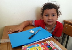 | ユニセフが支援するタルトゥースの学校クラブで、新しい学用品をうけとった女の子。 |