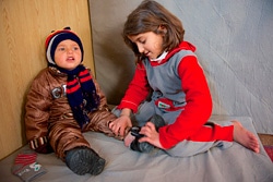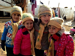 | レバノンの難民キャンプで、支援物資の防寒着を身にまとう、シリア避難民の子どもたち。 |