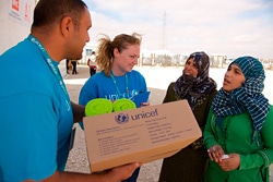| ヨルダンのザータリ難民キャンプに支援物資の冬の衣類キットを届けるユニセフ職員。 |