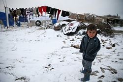 今年初めての寒波がレバノンを襲うなか、ユニセフは子どもたちへの支援を強化しています。82万人を超えるシリア難民の子どもたちとその家族は、厳しい寒さの中、非公式テント居住区や共同避難所において生活しています。その生活は一段と厳しさを増し、悲惨な状況に直面しています。子どもたちが暖をとるための燃料はすでに底をつき、雪が積もったテントは重みに耐えきれずに今にも倒れそうです。