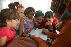 | 避難先のヨルダンで、教師の周りに集まり勉強するシリア難民の子どもたち |