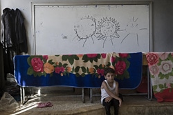 | シリア国内の避難所として使われている校舎の教室で、寝泊まりする子ども |