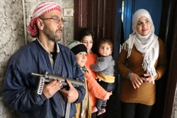| アレッポの政府側地域に隣接する地域に住むアブ・アブドゥルさん一家。外出する際は狙撃手から身を守らなければならない。 |