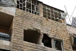 | ある朝アブ・アブドゥルさんの家を突然襲った一発の迫撃砲。一家は近所に引越した。避難民になるより最後まで街に残るのを選ぶと言う。 |