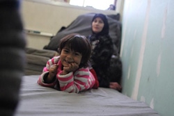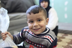 | アヒダさんの息子フセインくん3歳。ユニセフは子どもたちに防寒具やレクレーション・キットの配布も行っています。 |