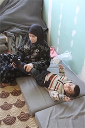 | フセインくんにユニセフが提供した新しい靴を履かせるアヒダさん。ユニセフは防寒具の支援も行っています。 |