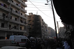 | アレッポの中心街を襲うたる爆弾。ドラム缶に高性能火薬と油を詰めてヘリから落下させる。建物を破壊した上に火災を起こし被害が広がる。 |