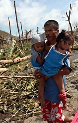 | 台風が上陸したタクロバン市内で2人の子どもを抱える男性。 |