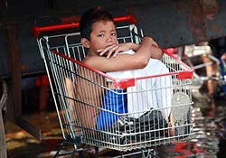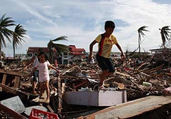 | 破壊された町を歩く子どもたち(タクロバン) |