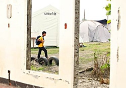 | フィリピン・タナワン市のサンロケ小学校に登校したマイケル・レリオスくん(13歳)。台風30号で学校が壊滅的な被害を受けました |