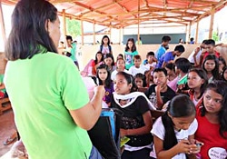 | サンロケ小学校の臨時の教室でマイラ・サルヴェ先生の話を聞く生徒 |