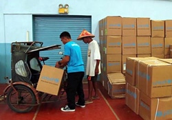 台風30号による被害発生のわずか2週間後の昨年11月22日にセブ島へ到着した、100トンの支援物資。この保健キットはその支援物資の一部として、スクール・イン・ア・ボックス(箱の中の学校)キットや、一時的な学習スペースのためのテント、その他の緊急支援物資とともに届けられました。