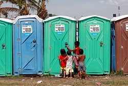| タクロバンの避難センターで簡易トイレを使うこどもたち。ユニセフの支援により設置されました。 |